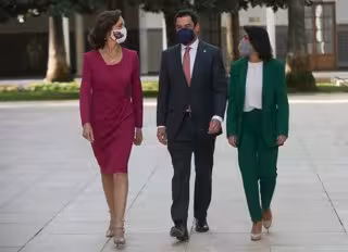 La presidenta de la Cámara de Cuentas, Carmen Núñez, el presidente de la Junta de Andalucía, Juanma Moreno, y del Parlamento, Marta Bosquet, este jueves antes de la toma de posesión de la primera. - MARÍA JOSÉ LOPEZ/EUROPA PRESS