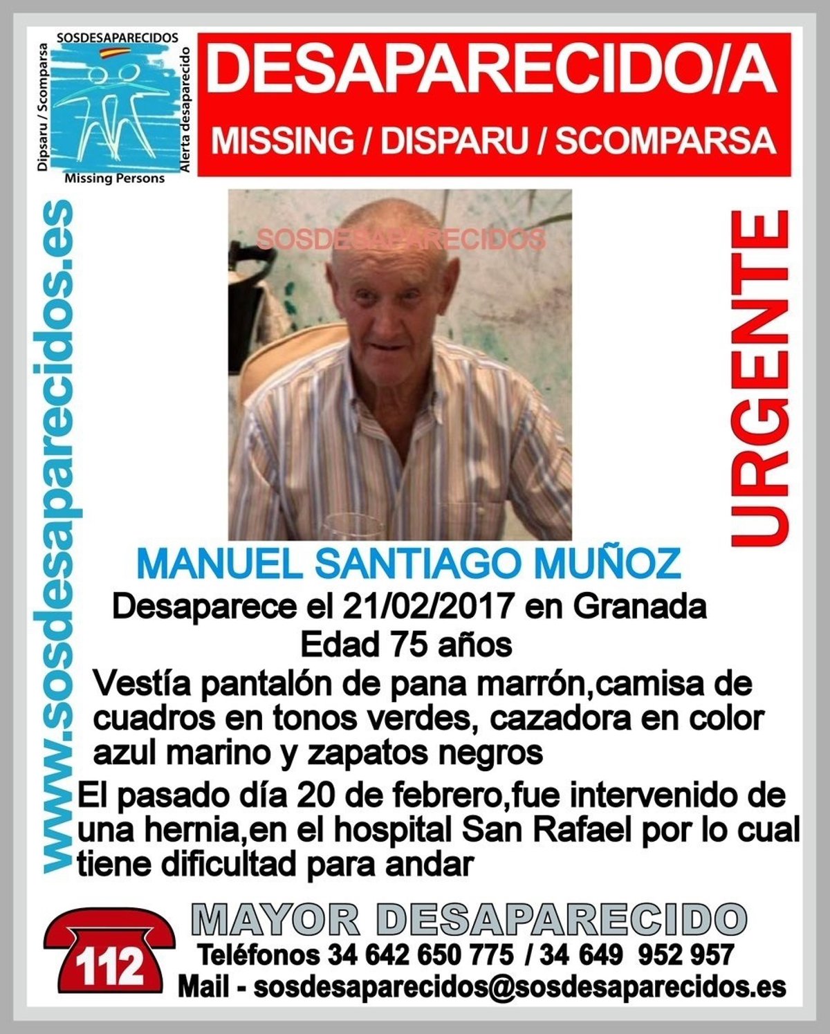En el momento en que desapareció llevaba pantalón de pana marrón, camisa de cuadros en tonos verdes, cazadora en color azul marino y zapatos negros, según consta en el cartel que se está difundiendo en las redes sociales por 'Sosdesaparecidos.es'. El pasado lunes fue intervenido en el Hospital San Rafael de una hernia, por lo que tiene dificultad para andar.