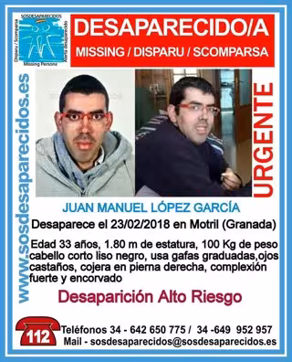 Según el cartel de la asociación 'SosDesaparecidos' compartido desde el perfil oficial de la Guardia Civil en la red social Twitter, se trata de Juan Manuel L.G., de 1,80 metros de estatura y 100 kilogramos de peso, y cabello corto liso negro. Con "cojera en la pierna derecha", tiene los ojos castaños y usa gafas graduadas.