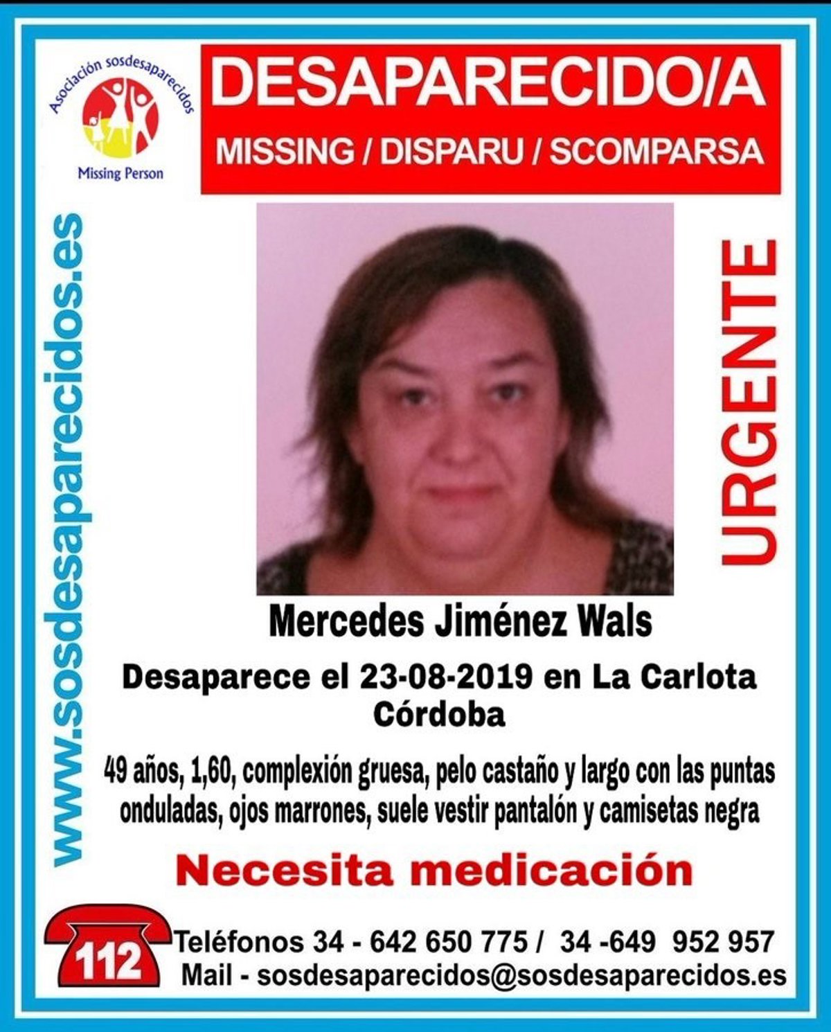 Asimismo, la información proporcionada por SOS Desaparecidos incide en que la desaparecida necesita medicación.