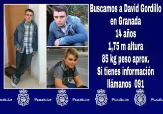 La Policía Nacional ha solicitado a través de su cuenta oficial de Twitter la colaboración ciudadana para encontrar a David Gordillo, un niño de 14 años que permanece desaparecido y que "podría estar en Granada".
