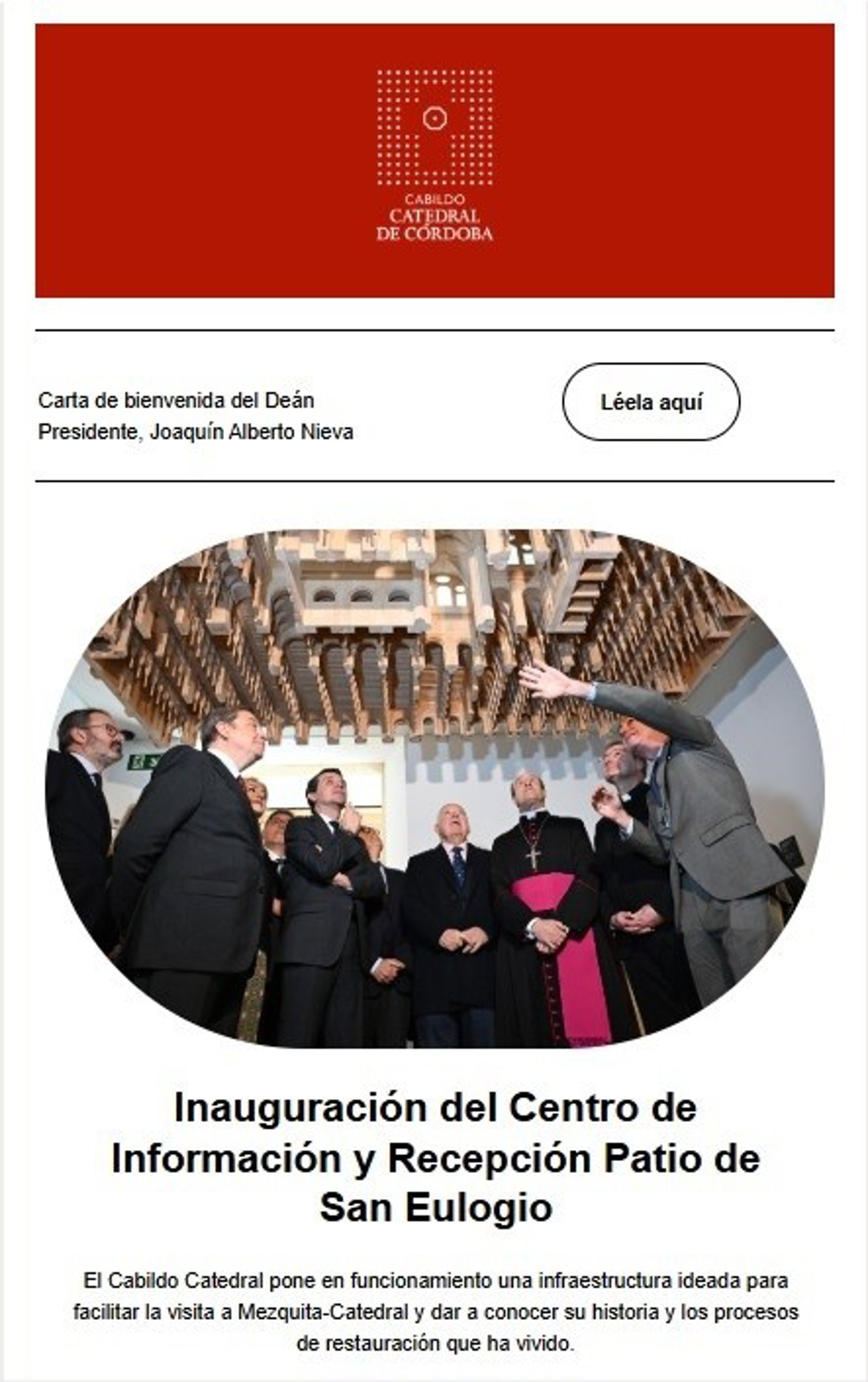Con el lanzamiento de esta 'newsletter', el Cabildo Catedral de Córdoba continúa avanzando en su estrategia de comunicación, apostando por "herramientas que contribuyan a una mayor transparencia y a una relación más estrecha con la sociedad".