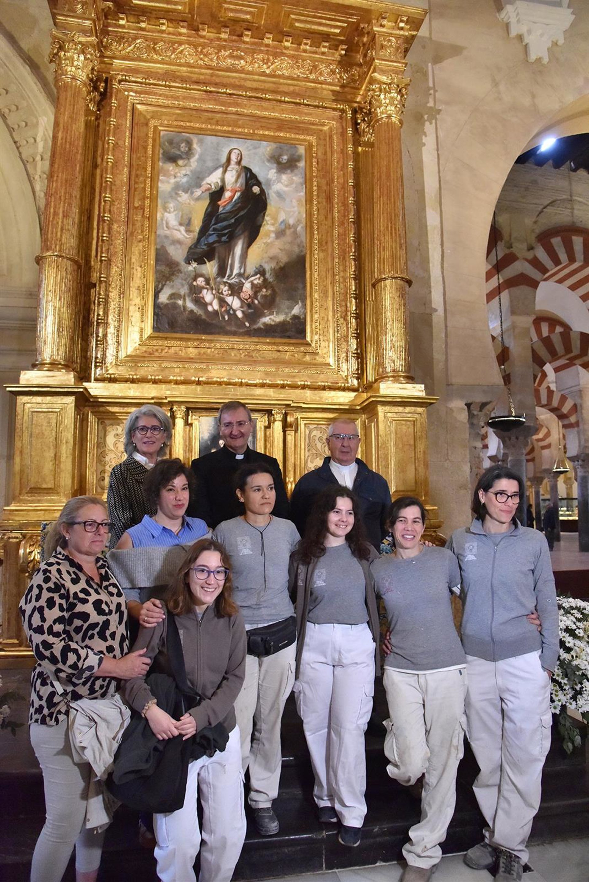 Archivo - Joaquín Alberto Nieva (al fondo, centro), junto a Anabel Barrena (al fondo, izda.), posan ante el altar de Santa Marta con el equipo de restauración que lo ha recuperado. - CABILDO CATEDRAL DE CÓRDOBA - Archivo