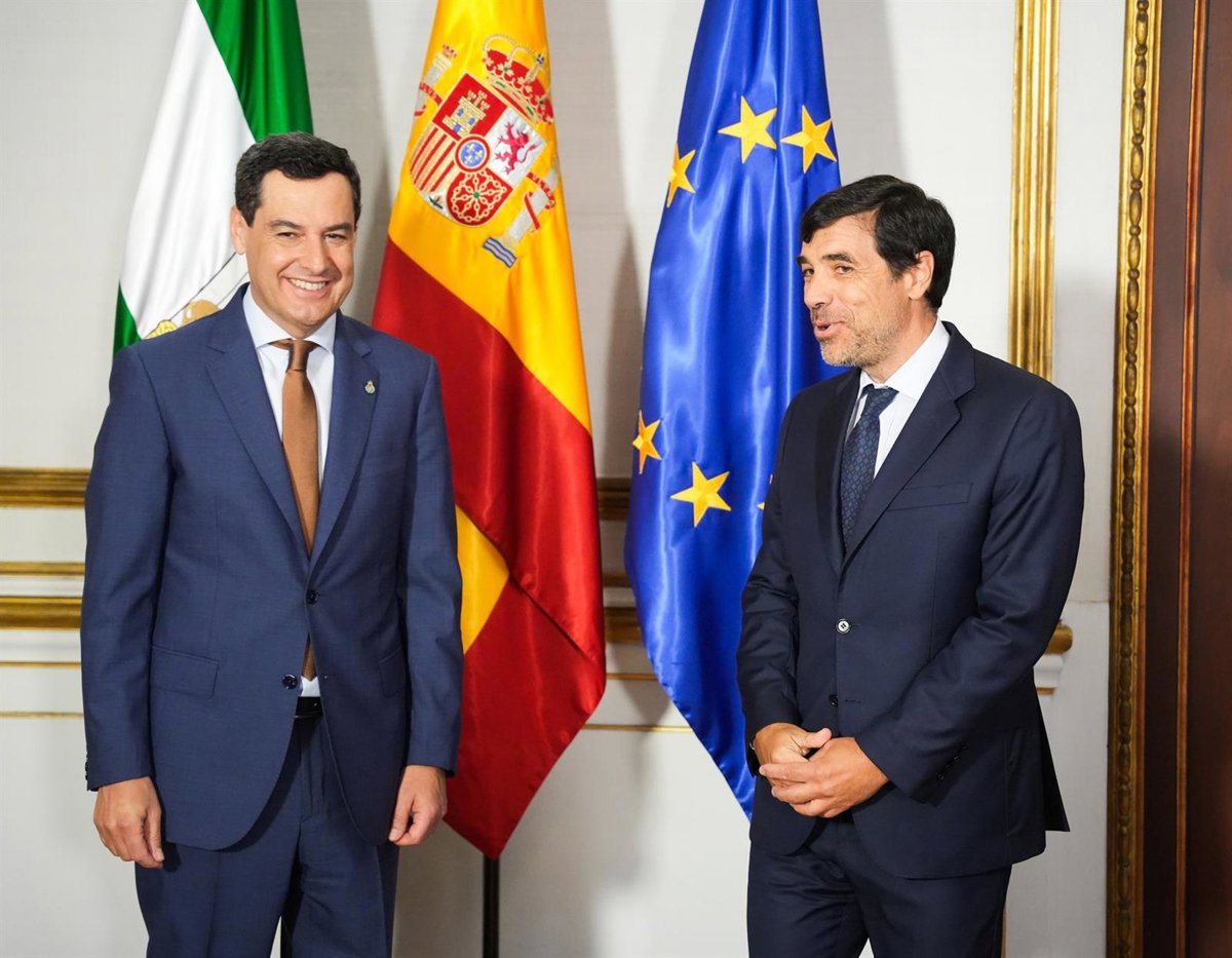 El presidente de la Junta de Andalucía, Juanma Moreno (i), durante nla reunión con el presidente de Kutxabank, Antón Arriola (d). A 09 de julio de 2025, en Sevilla (Andalucía, España). - María José López - Europa Press