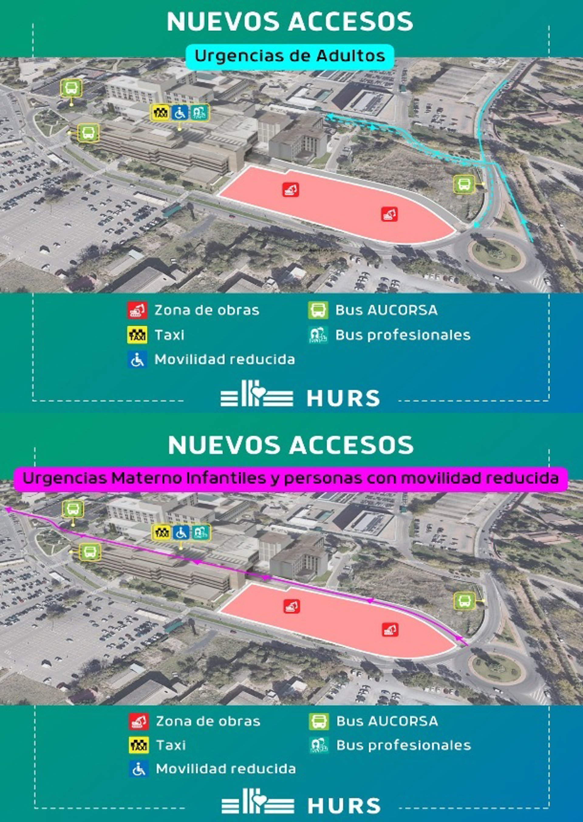 Urgencias Infantiles y Ginecológicas: Los vehículos que necesiten acceder a la puerta de estas urgencias (que se ubican en la calle cubierta) lo harán por el nuevo vial, que parte con una salida específica de la rotonda de Menéndez Pidal. Se trata de una calzada con una única dirección que desemboca en la rotonda de San Alberto Magno (donde se emplazan las paradas de bus de Aucorsa y el edificio de Gobierno).