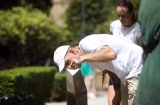 Archivo - Un hombre bebe agua de una fuente para combatir la ola de calor (Archivo) - Álex Zea - Europa Press - Archivo