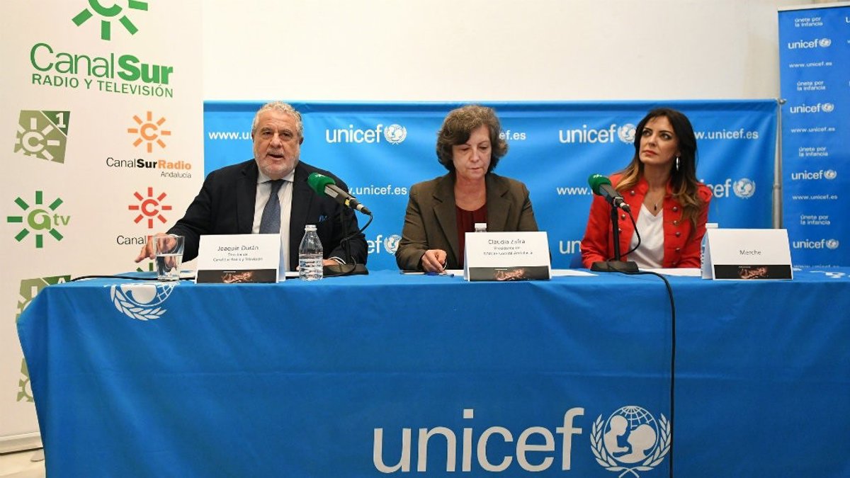 El director de Canal Sur Radio y Televisisión (CSRTV), Joaquín Durán, la presidenta de Unicef Comité Andalucía, Claudia Zafra, y la cantante Merche han presentado este martes en Sevilla la campaña #UnNombreUnaVida, centrada en la supervivencia de los bebés menores de un mes.