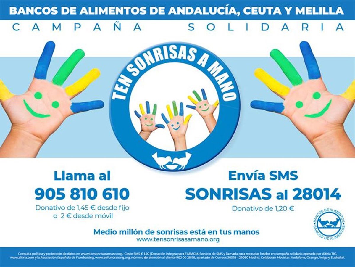 Durante los meses de marzo, abril y mayo, dentro de la campaña 'Ten sonrisas a mano' los Banco de Alimentos de Andalucía, Ceuta y Melilla van a realizar numerosas acciones para concienciar sobre las necesidades que sufren los de aquí, informar y dar a conocer las diferentes líneas de actuación que los Bancos de Alimentos llevan a cabo con sus beneficiarios como son sus programas de inserción sociolaboral y concienciación infantil o mostrar la constante lucha contra el despilfarro que estas organizaciones realizan desde sus orígenes.