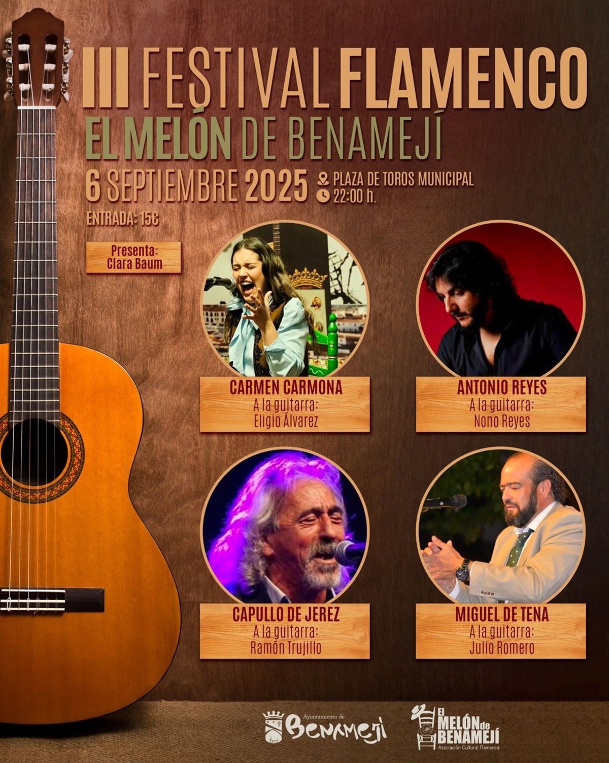También será protagonista Carmen Carmona Lara, de 22 años y natural de Benamejí, que se alza como "una de las voces emergentes más destacadas del panorama actual" y es la ganadora del Melón de Oro 2025 en el Festival de Lo Ferro. Llegará con la pasión y el compás que la caracterizan, junto a Eligio Álvarez a la guitarra.