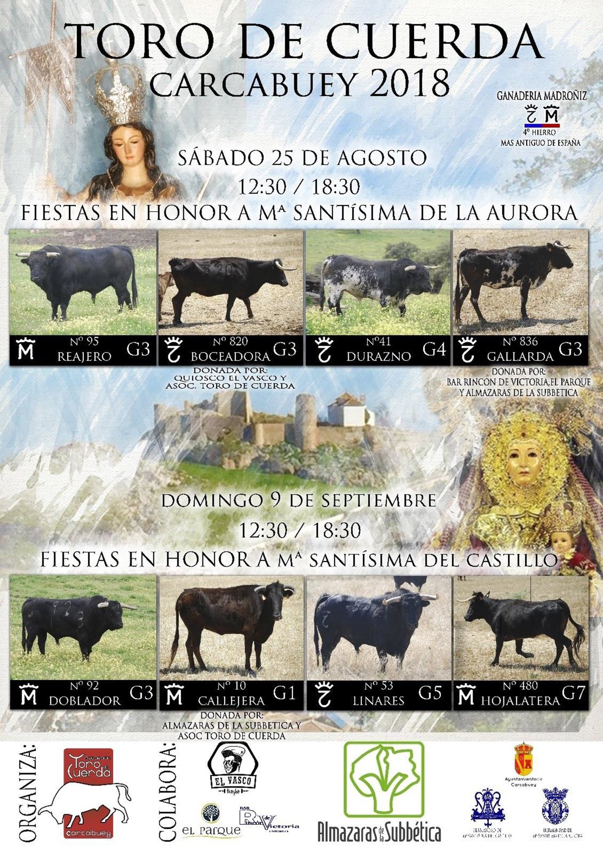 Cabe destacar que la Asociación del Toro de Cuerda de Carcabuey organiza este evento con la colaboración del Ayuntamiento de la población, las hermandades de María Santísima de la Aurora y de María Santísima del Castillo, Almazaras de la Subbética, Kiosko El Vasco, Bar Rincón de Victoria y El Parque.