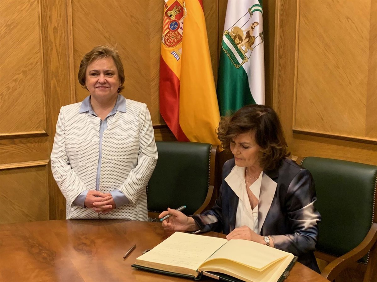 La presidenta del Consejo de Estado, Carmen Calvo, firma en el libro de honor del Consejo Consultivo de Andalucía junto a su presidenta, Jesús Gallardo Castillo. - CONSEJO CONSULTIVO DE ANDALUCÍA
