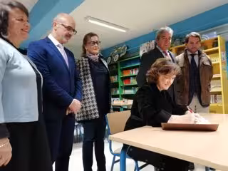 Carmen Calvo firma en el libro de honor del Colegio Público Carmen de Burgos, en Cabra (Córdoba), ante autoridades locales y provinciales. - EUROPA PRESS