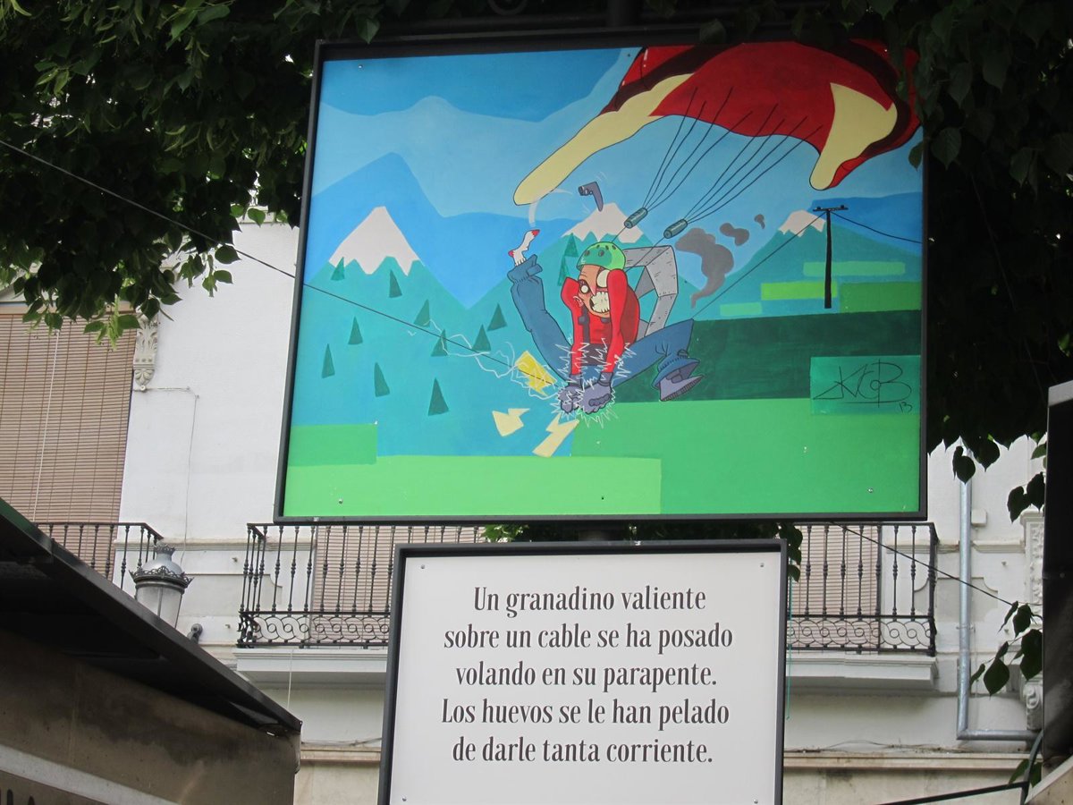 La caroca ganadora se titula 'Un granadino valiente' y el texto dice: Un granadino valiente/ sobre un cable se ha posado/ volando en su parapente./ Los huevos se le han pelado de darle tanta corriente.