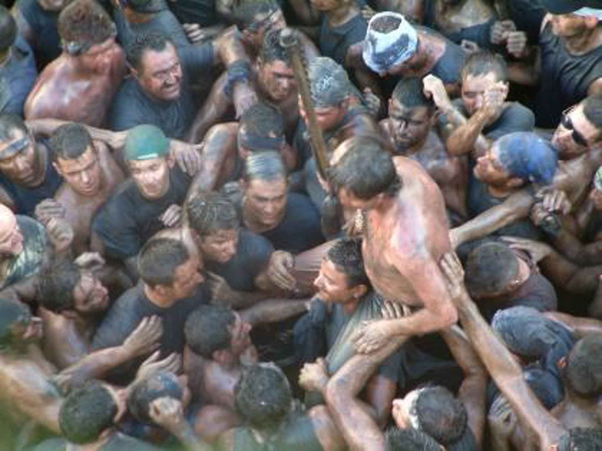 En la fiesta todos los participantes intentan manchar al Cascamorras con grasa y aceite, y siempre acaba totalmente embadurnado, dentro de un ambiente de camaradería y hermanamiento.