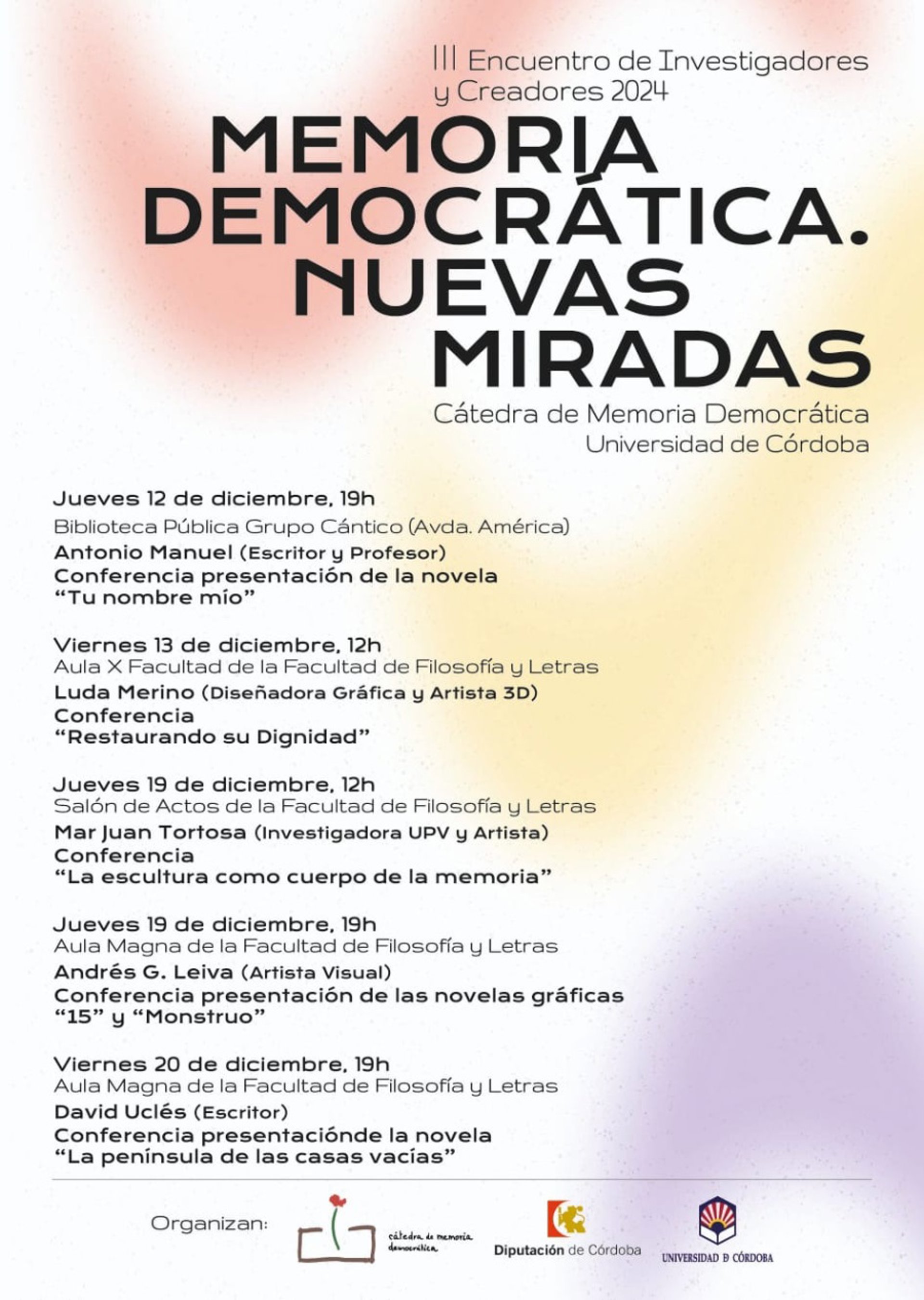 Entre los días 12 y 20 del presente diciembre, la Cátedra de Memoria Democrática de la Universidad de Córdoba (UCO) organizará su III Encuentro de Investigadores y Creadores, este año dedicado a la memoria como recurso creativo y bajo el título de 'Memoria Democrática. Nuevas Miradas'.