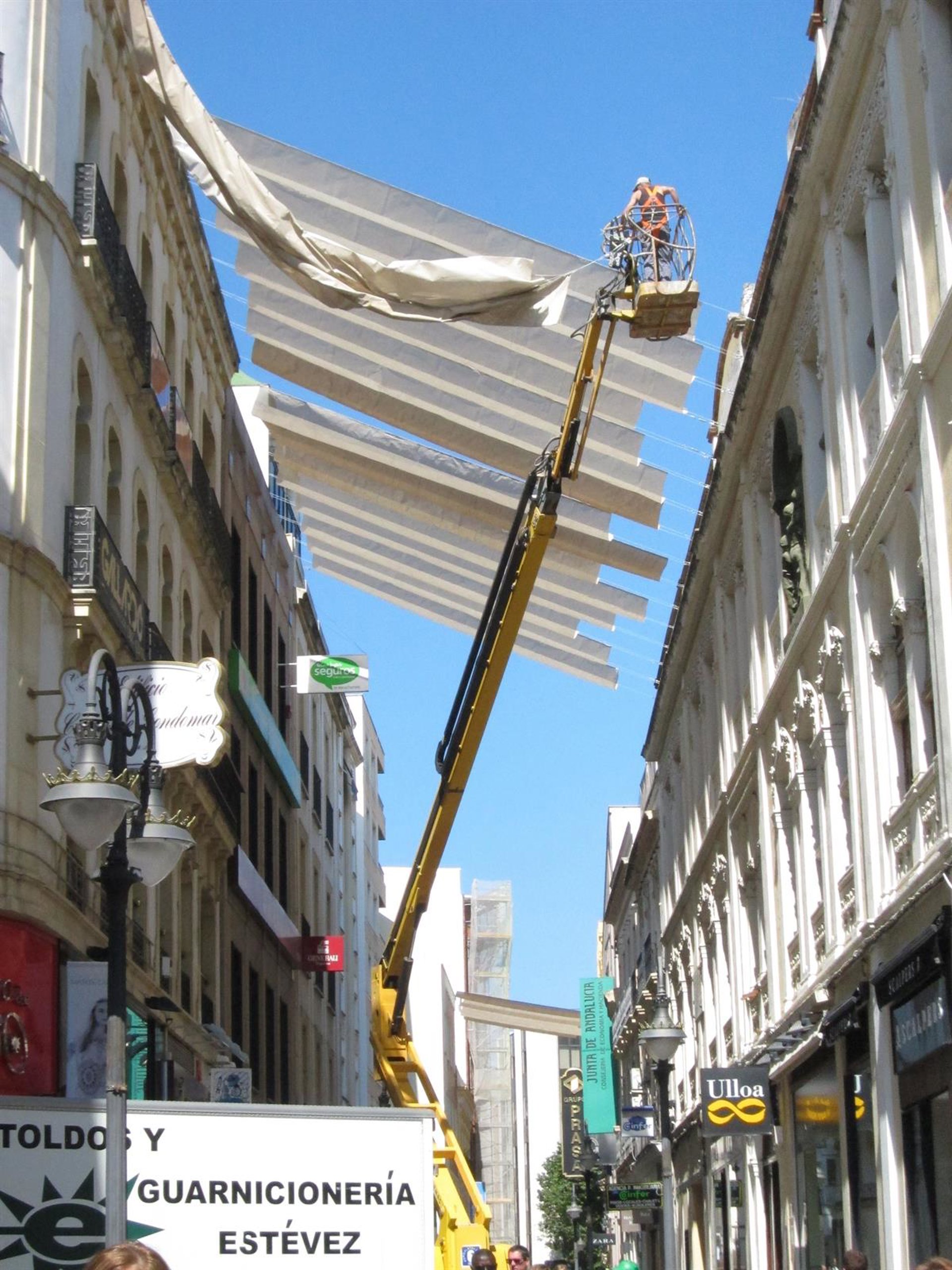 Un operario trabaja en altura colocando toldos en una calle de Córdoba. - EUROPA PRESS
