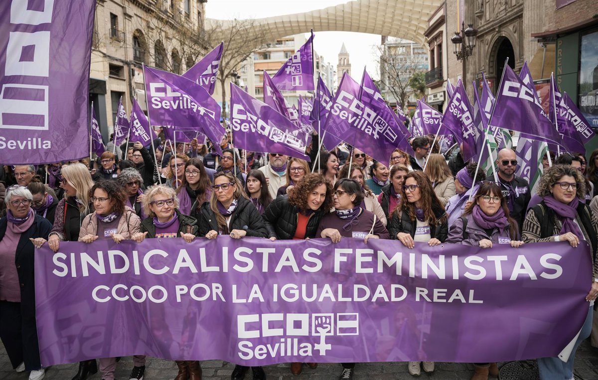Los sindicatos CCOO-A y UGT-A se han manifestado este viernes Sevilla, con motivo del Día Internacional de la Mujer. De este modo, ha tenido lugar dos manifestaciones, una con cada sindicato, que han confluido en la esquina de calle Tetuán y, desde allí, han continuado en una sola manifestación conjunta hasta Plaza Nueva, donde ambas organizaciones sindicales han leído un manifiesto.