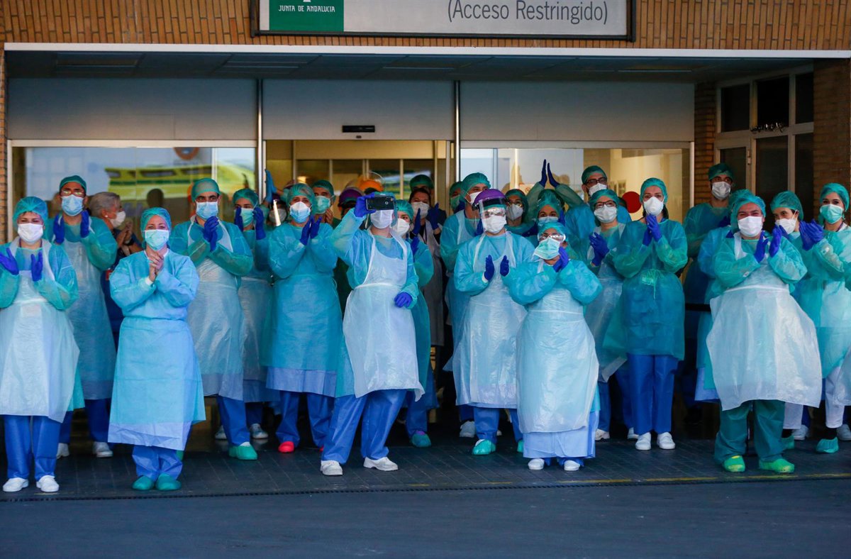 Sanitarios del Hospital Virgen del Rocío, aplauden a los taxistas en homenajea a Francisco José Ortega, primer taxista muerto por coronavirus en Sevilla a 02 de abril 2020 - Eduardo Briones - Europa Press