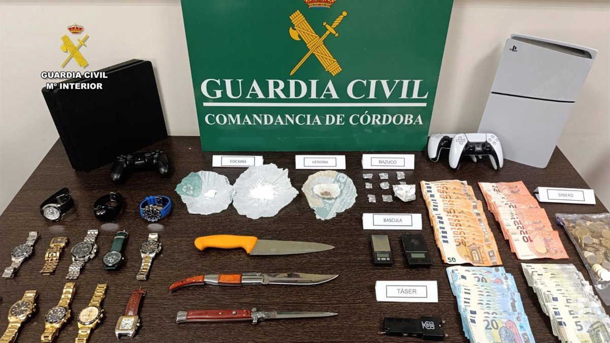 En el registro practicado, la Guardia Civil intervino, dos gramos de heroína, cuatro gramos de cocaína en roca, nueve dosis de bazuko, once gramos de sustancia de corte, dos básculas de precisión, tres motocicletas, una de ellas sustraída en Montilla, 12 relojes, una Play Station 5, 1.500 euros en metálico, ocho gallos, cuatro armas blancas, dos de ellas prohibidas y un dispositivo 'taser', cuyo origen no pudieron acreditar los usuarios de la vivienda.