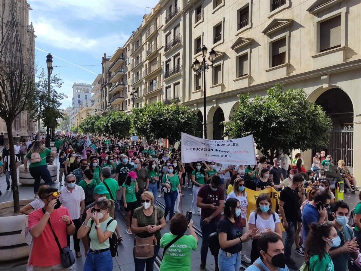 Además, en esta protesta, que ha partido desde el Palacio de San Telmo, sede del Gobierno andaluz, y ha finalizado en Las Setas, se ha pedido la estabilidad del profesorado interino, atención a los alumnos con necesidades específicas de apoyo educativo (NEAE) y más contratación de profesionales técnicos de integración social (PTIS), intérpretes de lengua de signos española (ILSE) y mediadores comunicativas para una atención "de calidad".
