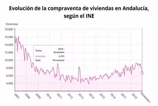 En cuanto al mes de diciembre, en Andalucía se vendieron 6.741 viviendas, lo que supone un 7,3 por ciento más que en diciembre de 2017. De estas, 6.082 fueron libres, 659 protegidas. Asimismo, se realizaron 1.238 transacciones sobre vivienda nueva y 5.503 sobre vivienda usada.