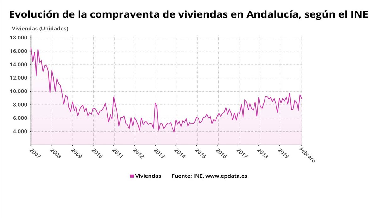 La compraventa de viviendas ha aumentado en Andalucía un 8,0% durante el pasado mes de febrero en comparación con el mismo periodo del año anterior, tras intercambiarse un total de 8.882 inmuebles, según los datos difundidos este martes por el Instituto Nacional de Estadística (INE), que precisa que a nivel nacional la compraventa de viviendas ha incrementado un 0,1% hasta alcanzar las 44.104 operaciones.