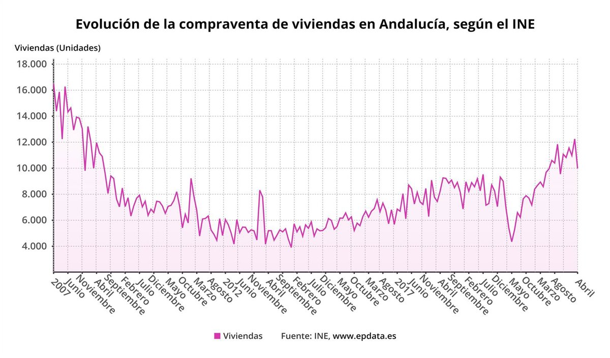 La compraventa de viviendas en Andalucía en abril ha aumentado un 16,3% respecto al mismo mes del año anterior, hasta sumar un total de 9.984 operaciones, un porcentaje que supera en 4,4 puntos al crecimiento registrado a nivel nacional (11,9%).