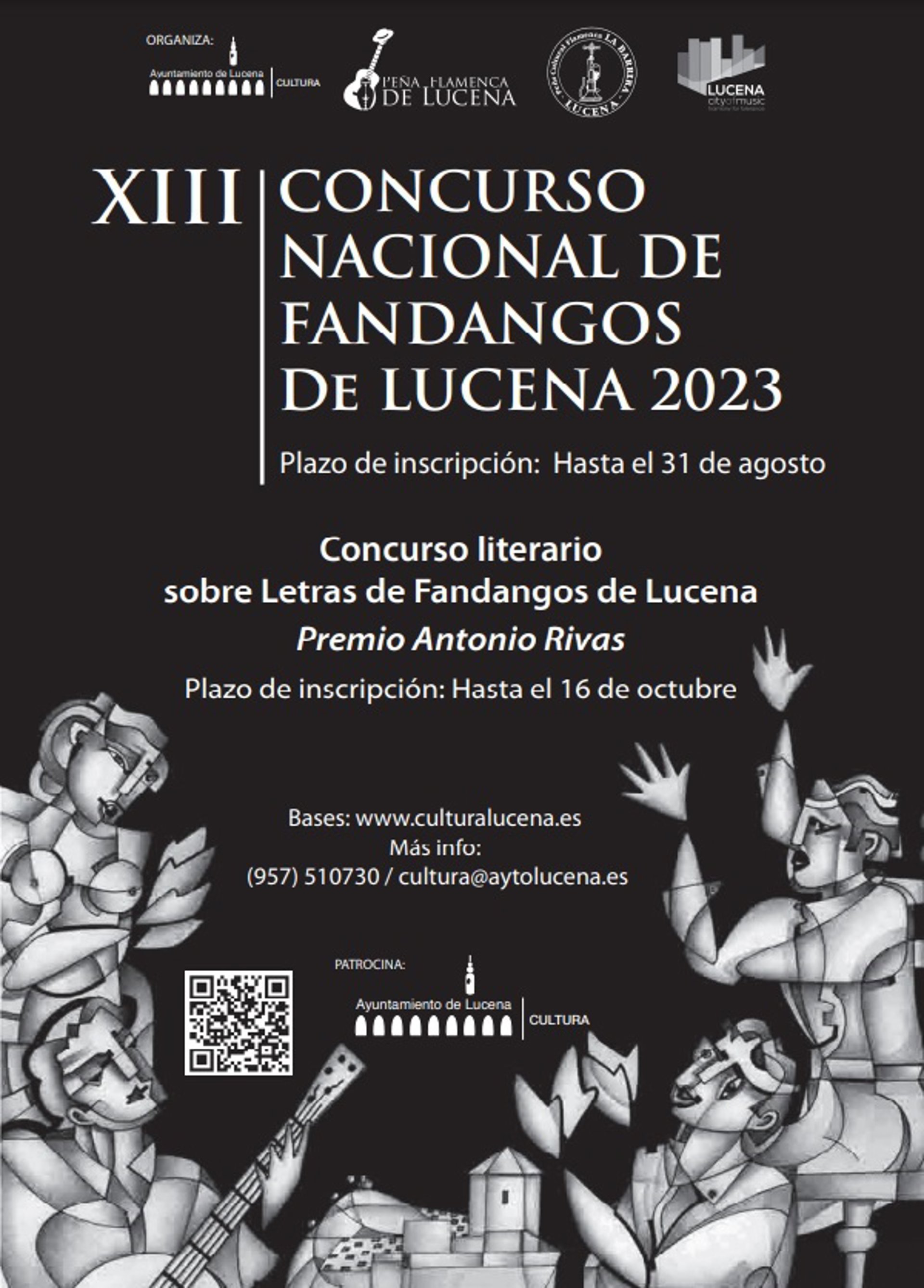 La Delegación de Cultura del Ayuntamiento de Lucena (Córdoba) informa de que hasta el día 31 de agosto permanece abierto el plazo de inscripción del XIII Concurso Nacional de Fandangos de Lucena, que retoma como en ediciones anteriores, el Concurso Literario sobre Letras de Fandangos de Lucena, 'Premio Antonio Rivas', dotado con 300 euros más velón a la mejor letra compuesta para este cante y el Premio Especial 'Paco de Lucena-Ciudad Creativa de la Música', con 150 euros más velón a la mejor letra relacionada con la figura del guitarrista lucentino.