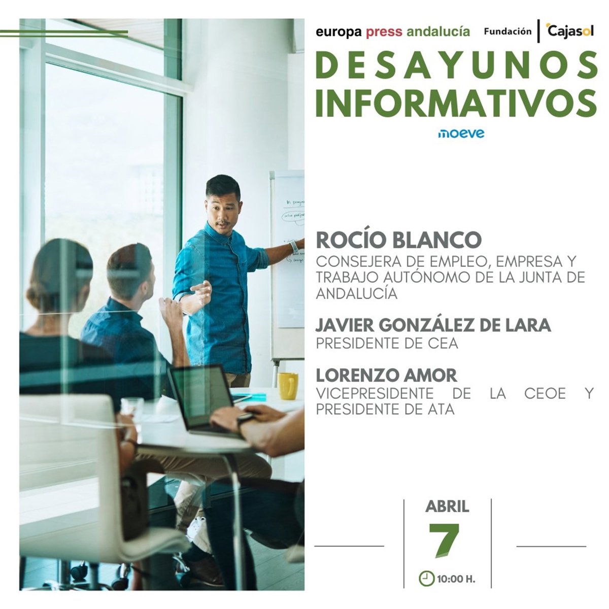 Cartel anunciador del desayuno informativo de Europa Press Andalucía con la consejera de Empleo, Rocío Blanco, y los presidentes de la CEA, Javier González de Lara, y de ATA, Lorenzo Amor, el lunes 7 de abril en Sevilla - EUROPA PRESS