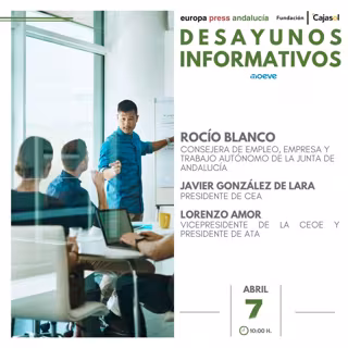 Europa Press Andalucía organiza este lunes 7 de abril en Sevilla de la mano de la Fundación Cajasol y con el patrocinio de Moeve una nueva edición de sus desayunos informativos con la consejera de Empleo, Empresa y Trabajo Autónomo de la Junta, Rocío Blanco, y los presidentes de la Confederación de Empresarios de Andalucía (CEA), Javier González de Lara, y de la Asociación de Trabajadores Autónomos (ATA), Lorenzo Amor.