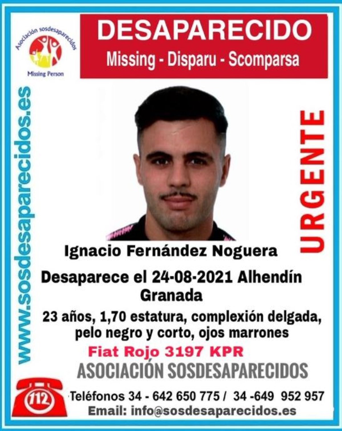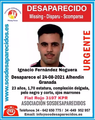 Continúan las labores de búsqueda de Ignacio Fernández Noguera, un joven de 23 años de Alhendín (Granada) que sigue en paradero desconocido desde el pasado 24 de agosto, según denunciaron a las autoridades sus familiares. Aunque la familia no pierde la esperanza de localizarlo, asegura que a su hijo "le ha pasado algo".