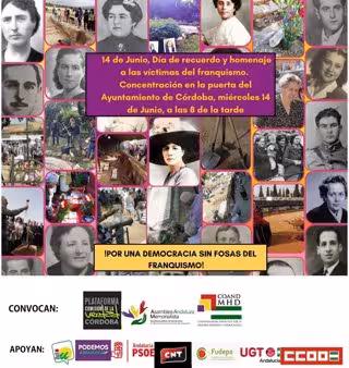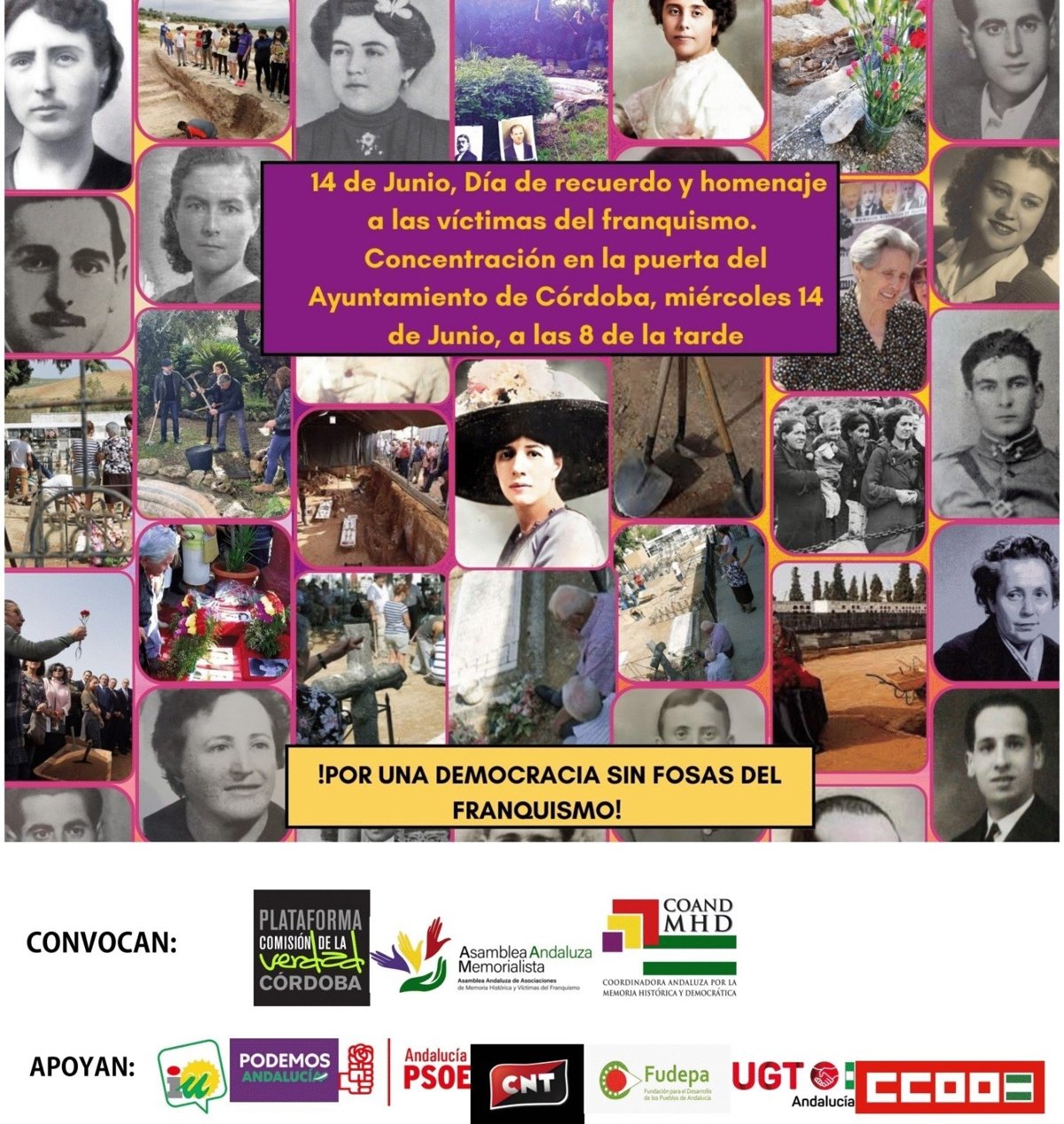 La Plataforma Cordobesa por la Comisión de la Verdad y Víctimas del Franquismo, la Asamblea Memorialista Andaluza y la Coordinadora Andaluza por la Memoria Histórica y Democrática, con el apoyo de las organizaciones políticas y sindicales PSOE, IU, Podemos, UGT y CCOO, han convocado una concentración este miércoles "para recordar y rendir homenaje a las víctimas del golpe militar y de la dictadura franquista en nuestra ciudad".