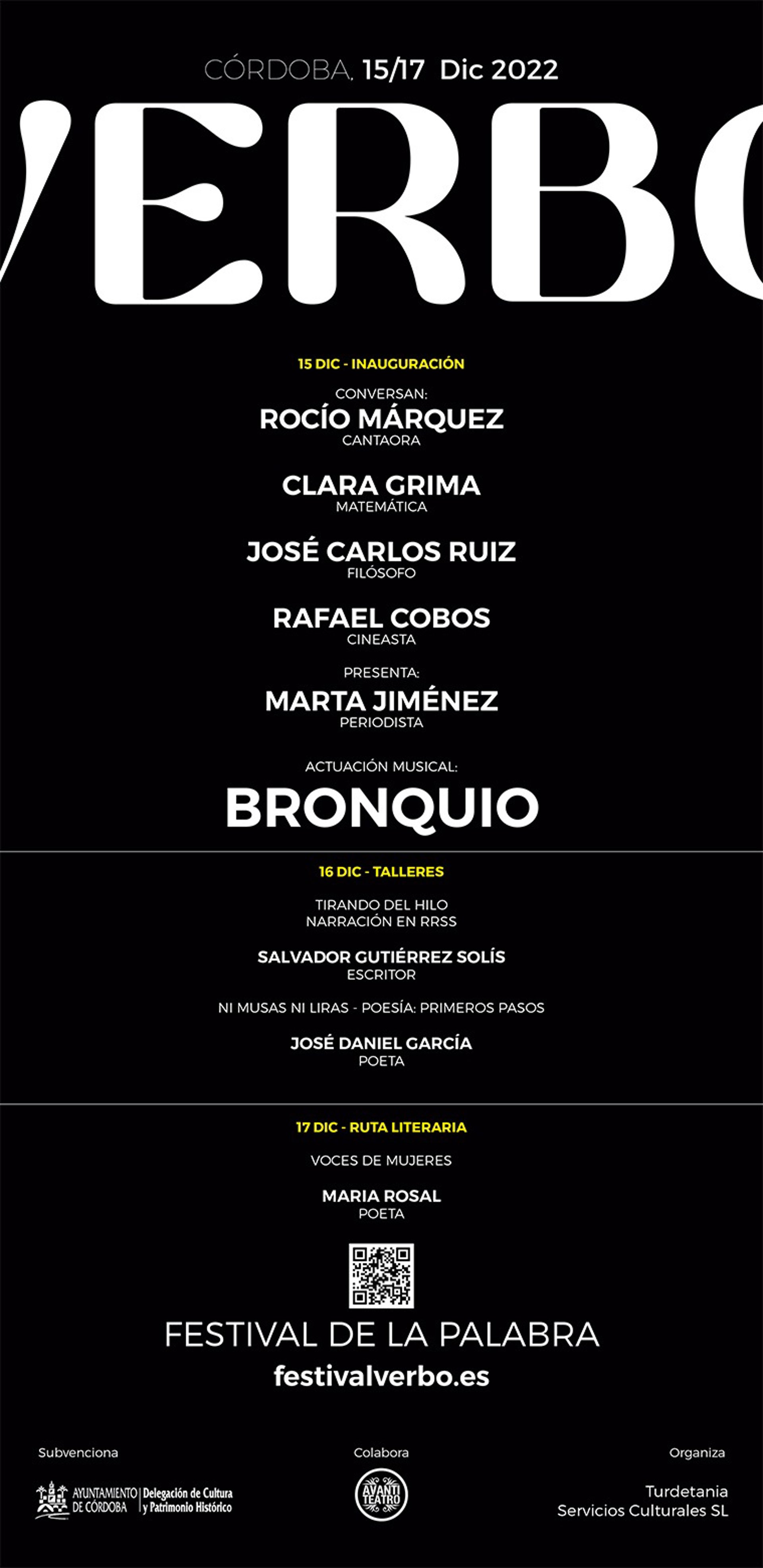 Entre los próximos días 15 y 17 del presente mes de diciembre se celebrará en Córdoba la primera edición de 'Verbo, Festival de la Palabra', un encuentro multidisciplinar, en el que "destacadas personalidades de la cultura, la ciencia o la filosofía conversarán sobre la importancia de la palabra como medio creativo, canal de conocimiento y punto de encuentro".