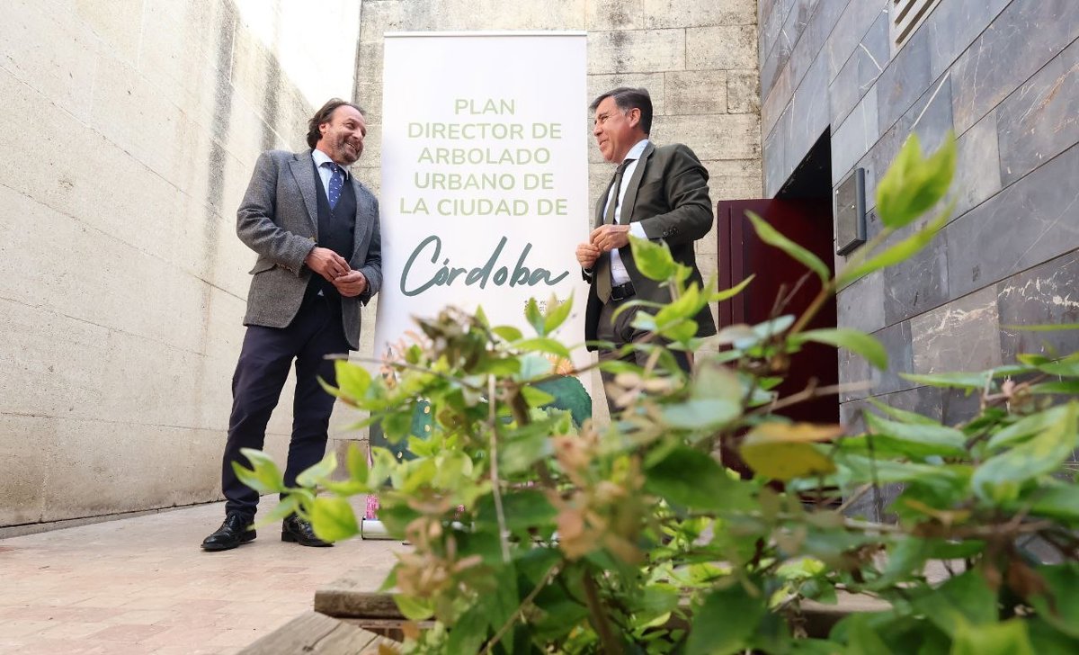 El delegado de Infraestructuras en el Ayuntamiento de Córdoba, Miguel Ruiz Madruga, y el delegado de Medio Ambiente y Sostenibilidad, Daniel García-Ibarrola, han presentado este miércoles el diagnóstico del Plan Director de Arbolado, que determina que la cobertura arbórea es cercana al 18%, cuando el consenso internacional refleja que las ciudades deben de estar entre el 20 y el 25 y algunas lo amplían al 30%, de modo que se han comprometido a llegar al 20% de cobertura en los próximos cinco años y al 25%, en los cinco siguientes.