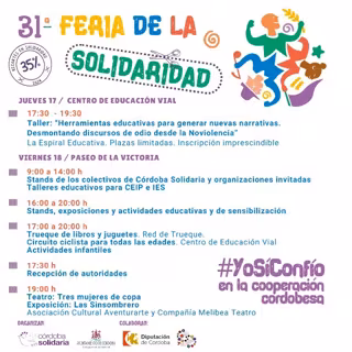 Córdoba Solidaria organiza, un año más, la Feria de la Solidaridad, evento que se celebra su 31 edición los días 17 y 18 de octubre en el Paseo de la Victoria (a la altura del Centro de Educación Vial) con estands informativos de entidades sociales y de cooperación de la ciudad, actividades infantiles, red de trueque, talleres y muchas más actividades.