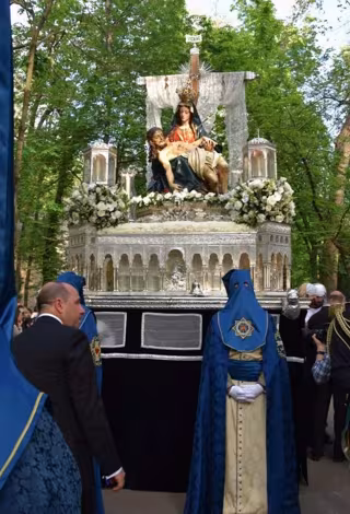 La postal muestra la imagen de la Virgen de las Angustias Coronada con un Cristo yacente en sus brazos, tallada en 1750 por el escultor Torcuato Ruiz del Peral, en su primera estación de penitencia tras la pandemia. El paso, en plata de ley, está inspirado en el Palacio de los Leones de la Alhambra.