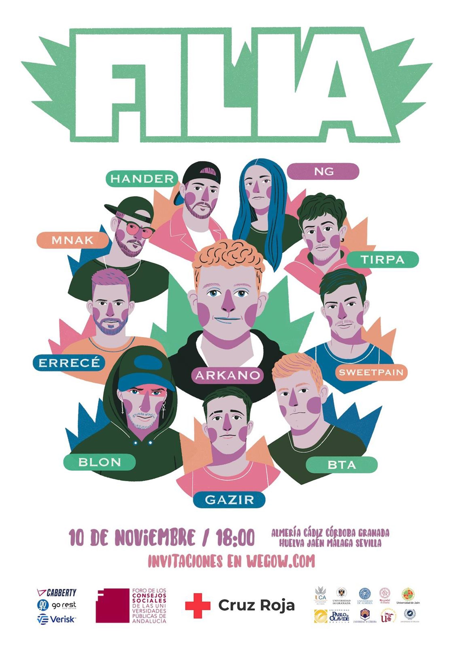 Cruz Roja lanza 'Filia', una iniciativa de sensibilización que se estrena de manera pionera y simultáneamente en las ocho provincias de Andalucía el 10 de noviembre a las 18,00 horas. Con Arkano como embajador de la campaña en redes sociales, se hablará sobre derechos humanos en actos en nueve universidades públicas de Andalucía (Almería, Cádiz, Córdoba, Granada, Jaén, Huelva, Málaga, Sevilla y Pablo de Olavide) de la mano de los 'freestylers' Blon, Mnak, Gazir, Tirpa, Sweetpain, NG, Errecé, BTA y Hander.