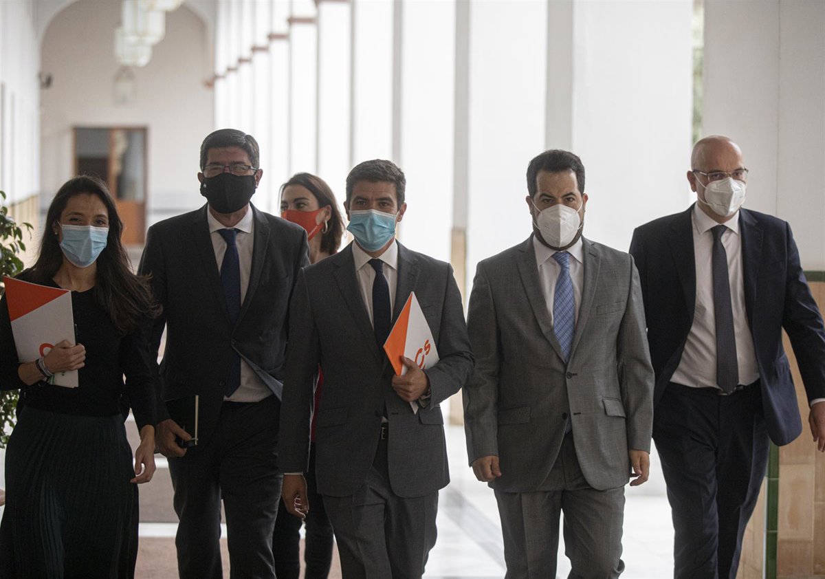 El vicepresidente de la Junta de Andalucía, Juan Marín (2i); junto al portavoz del grupo parlamentario Ciudadanos, Sergio Romero (3i), y varios diputados de su grupo parlamentario, a su llegada al Debate sobre el Estado de la Comunidad en el Parlamento - María José López - Europa Press