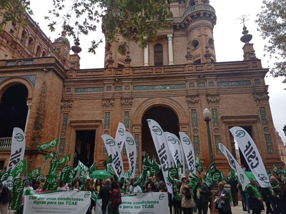 La Central Sindical Independiente y de Funcionarios (CSIF) en Andalucía ha protagonizado este jueves una concentración autonómica ante la Subdelegación del Gobierno en Sevilla, en la Plaza de España, para reclamar a los Ministerios de Sanidad y de Educación y Formación Profesional un mayor reconocimiento profesional y laboral del colectivo de técnicos en cuidados auxiliares de enfermería (TCAE).
