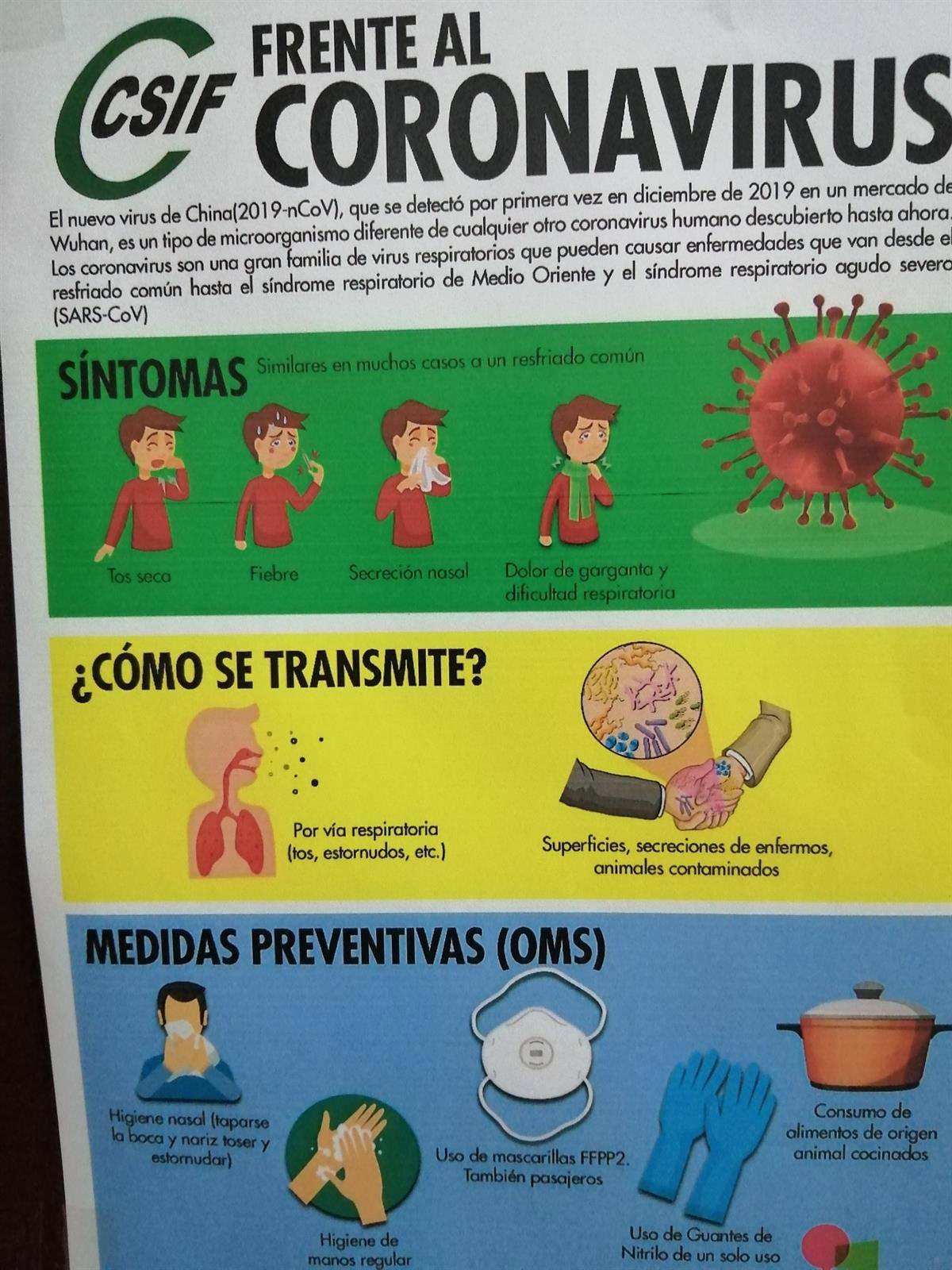Por otro lado, CSIF ha elaborado un material informativo relacionado con el coronavirus, sus síntomas, modos de transmisión y medidas preventivas generales establecidas por la Organización Mundial de la Salud (OMS), que el sindicato ha difundido a través de su boletín de Acción Sindical.