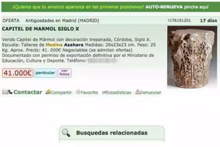 La Consejería de Cultura de la Junta de Andalucía, ante la aparición de diversos anuncios, en distintas páginas web de venta por Internet, ofreciendo por algo más de 40.000 euros un supuesto capitel procedente de la antigua ciudadela califal de Medina Azahara, en Córdoba, ha abierto una investigación al respecto.