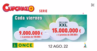 El Cuponazo de la ONCE ofrece todos los viernes, por tres euros, un premio a las cinco cifras más serie de 9 millones de euros, y seis segundos premios de 100.000 euros a otras tantas extracciones, también con serie. Si se opta por el Cuponazo XXL, por cinco euros, el premio sube a 15 millones y 200.000 euros, respectivamente.