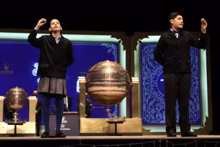 Dos de los niños de la residencia de San Ildefonso cantan uno de los quintos premios durante la celebración del Sorteo Extraordinario de la Lotería de Navidad 2021 en el Teatro Real de Madrid. - Eduardo Parra - Europa Press