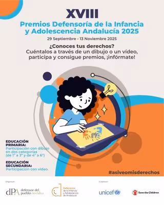 La Defensoría de la Infancia y Adolescencia de Andalucía ha puesto en marcha la XVIII edición del Premio de Dibujo y Víedo 'Así veo mis derechos', en el que invita a participar, desde este lunes, día 28 de septiembre, hasta el 13 de noviembre, a los más de 3.500 centros educativos de la comunidad autónoma, de Educación Primaria, Educación Secundaria y Educación Especial, públicos y privados.