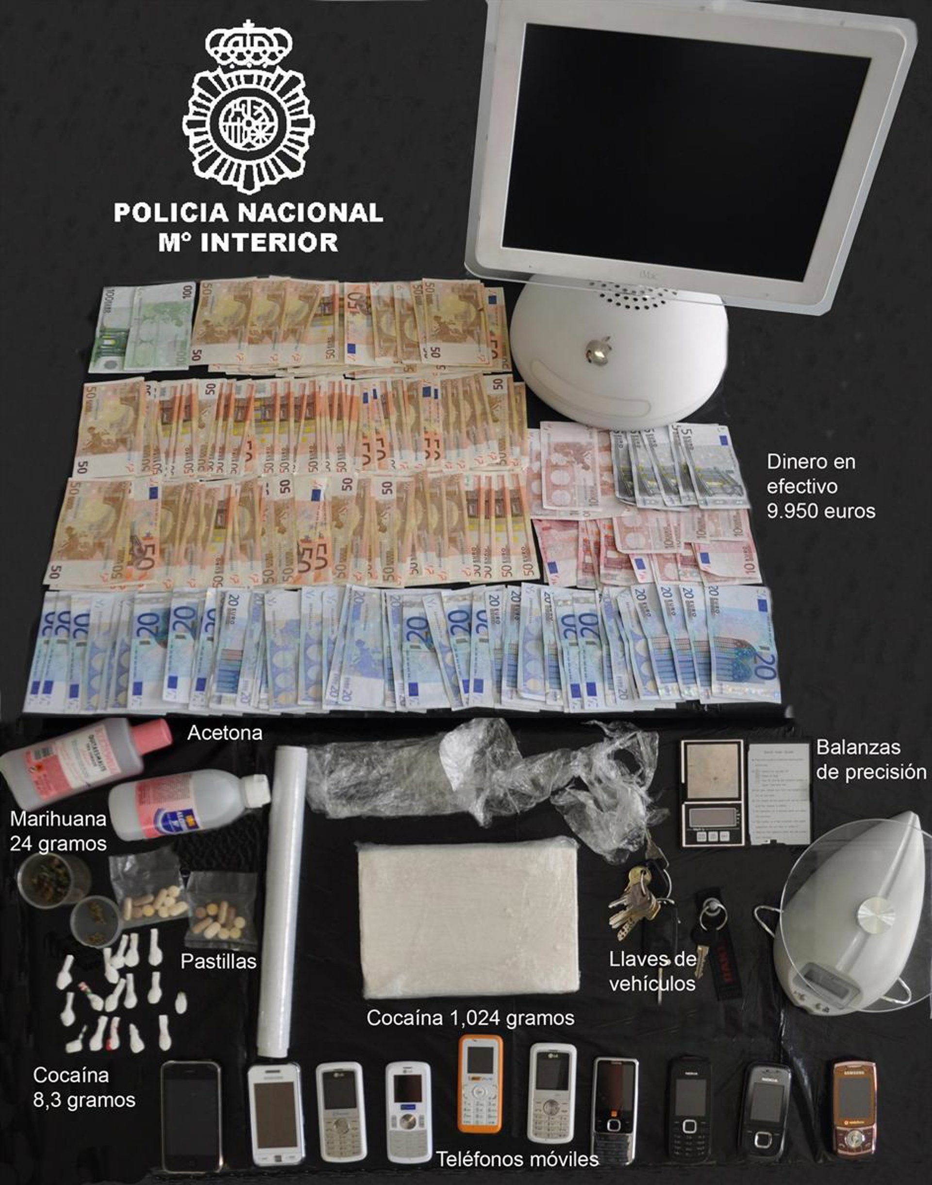 El total de la cocaína intervenida por los policías ha sido de 1.034 gramos, que en el mercado ilícito de la droga alcanzaría probablemente un valor de 62.000 euros, según la tabla de valoraciones oficial. Los efectos intervenidos, además de la droga, totalizan dos vehículos, 10 teléfonos móviles, un ordenador y útiles de laboratorio, además de los 9.350 euros iniciales.
