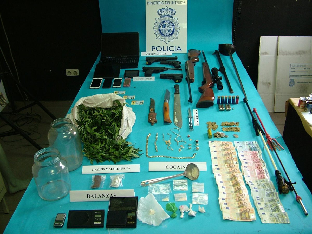 También se incautaron de seis gramos de heroína, 25 gramos de cocaína y de 40 gramos de hachís, además de 810 euros en efectivo, cuadernos con anotaciones, una bascula, ocho armas blancas, dos carabinas, cuatro pistolas simuladas, diversas joyas por valor de 5.000 euros, cuatro teléfonos móviles y un ordenador portátil, resultando que dos de los terminales telefónicos habían sido denunciados por sus legítimos propietarios como sustraídos con anterioridad, al igual que un ordenador portátil y tres DNI. La investigación continua abierta, no descartándose nuevas detenciones.