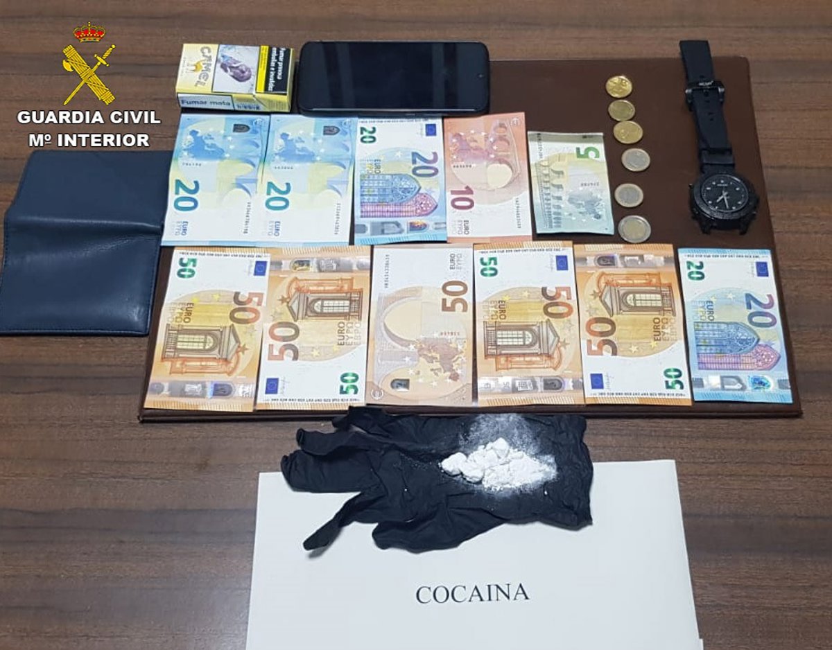 En el registro corporal practicado al sospechoso, los agentes localizaron entre sus ropas una bolsita con siete gramos de cocaína, preparada y dispuesta para su venta en roca, que fue intervenida. Asimismo, también le intervinieron 350 euros en billetes fraccionados, al parecer producto de la venta de la droga. Ante ello, se procedió a su detención como supuesto autor de un delito de tráfico de drogas.