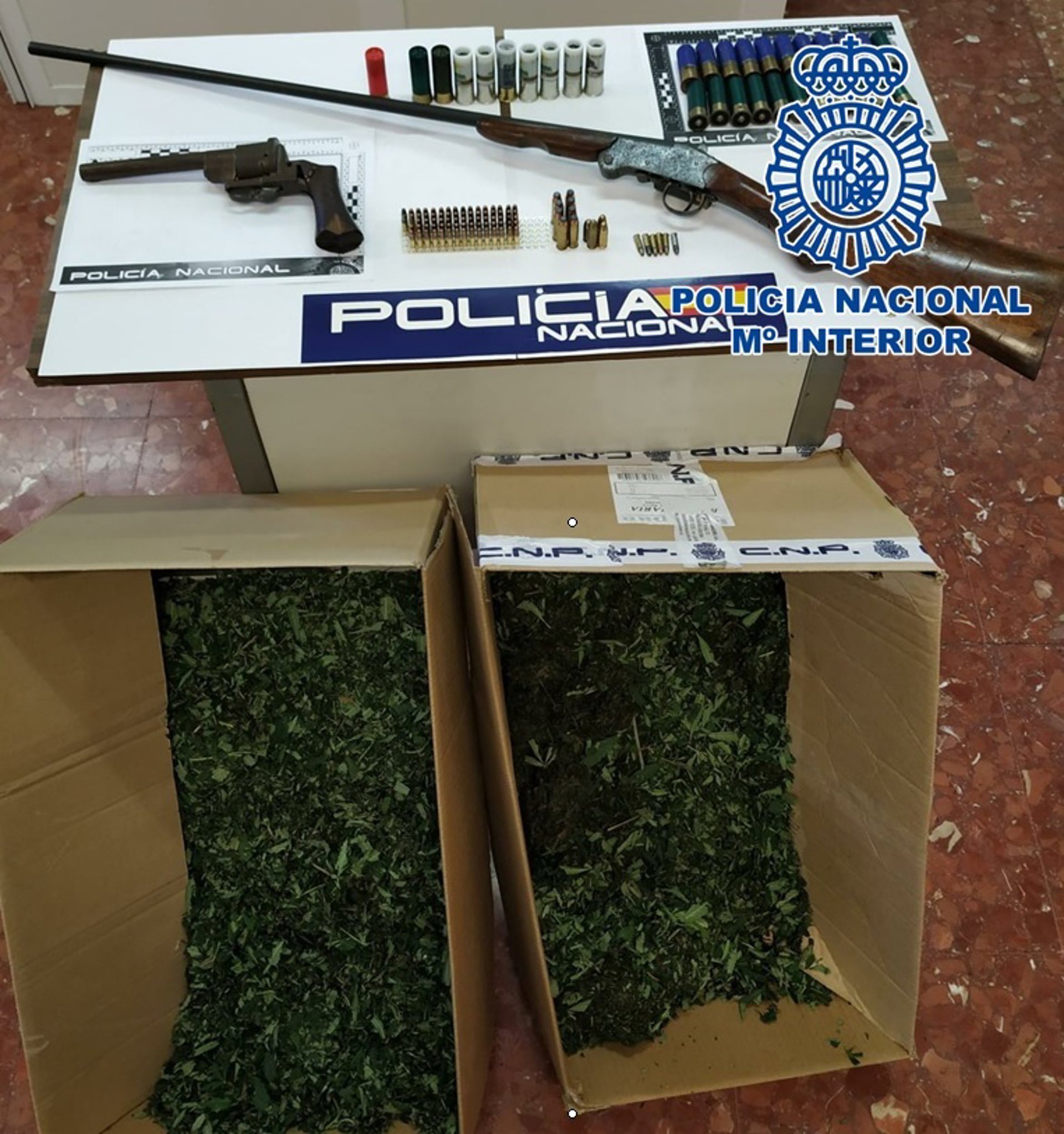La Policía Nacional ha detenido a un hombre de mediana edad como presunto autor de un delito contra la salud pública y otro de tenencia ilícita de armas, todo ello fruto de una investigación desarrollada por agentes de la Comisaría Provincial en la que se incautaron, entre otros objetos, un revólver, una escopeta y 16 kilos de marihuana, además de distinta munición.