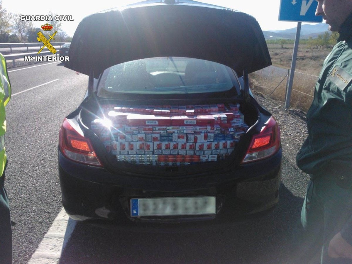 La Guardia Civil ha detenido a un hombre de 29 años como presunto autor de un delito de contrabando después de que fuera sorprendido en un control de carretera con 4.590 cajetillas de tabaco de distintas marcas que transportaba en el maletero de su vehículo.