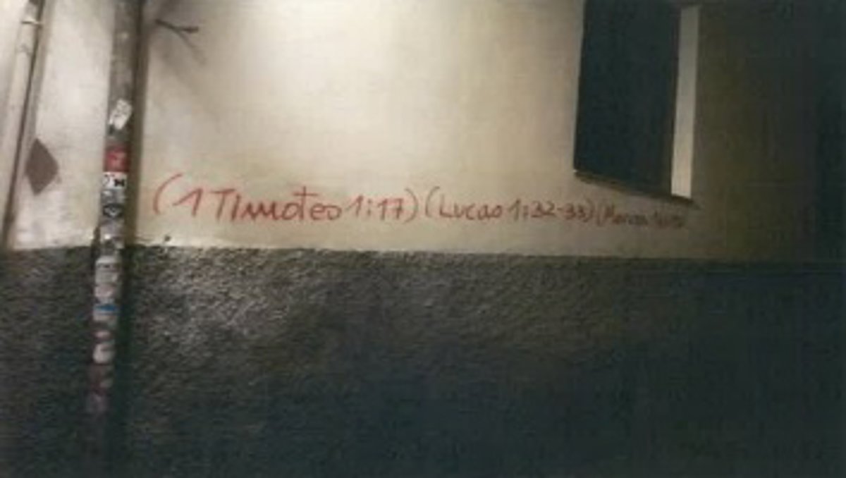 Una vez identificado, se le incauta un bote de pintura en spray, de color rojo, con el que acababa de realizar una grafiti en el lugar, pintando en la pared el texto '(1 Timoteo 1:17) (Marcos 16:15)', que hacen referencia a citas bíblicas.